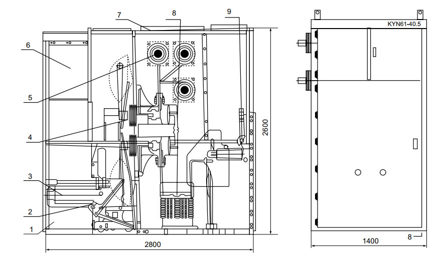 1、殼體、 2、活門支架、 3、斷路器手車、 4、觸頭盒、 5、母線套管 6、儀表室、 7、泄壓裝置 、8、電流互感器、 9、接地開關